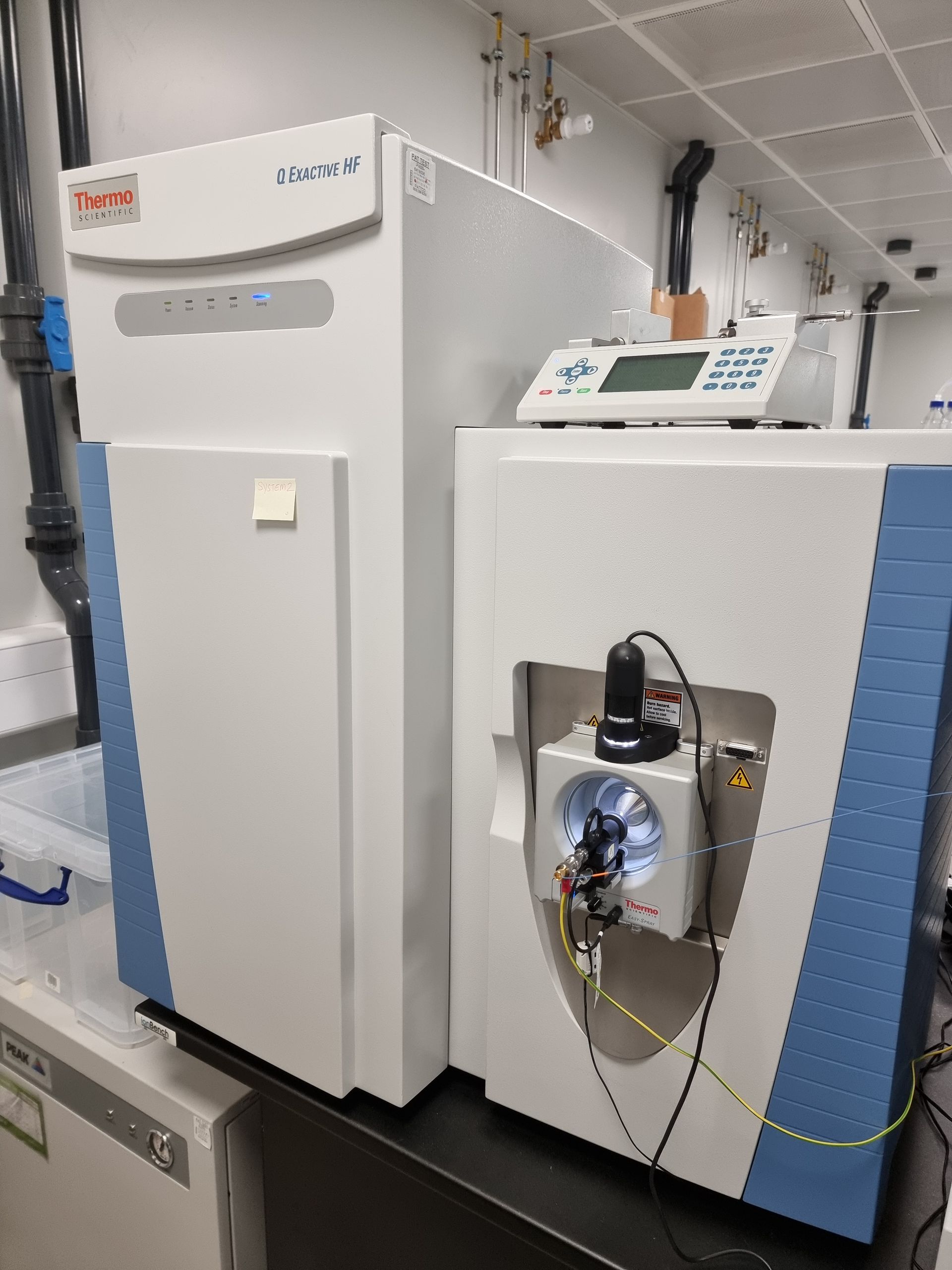 - Dedicated instrument bench, housing the two sogevac vacuum pumps, nano and HESI source housing Coupled with Dionex U3000 Nano LC system